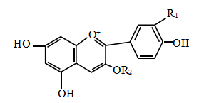 This production is composed of Anthocyanosides mainly, such as Anthocyanidin-3-galactoside, Anthocyanidin-3-arabofuranoside, Paeonidin-3-galactoside and Paeonidin-3-arabofuranoside. Structural formulas are